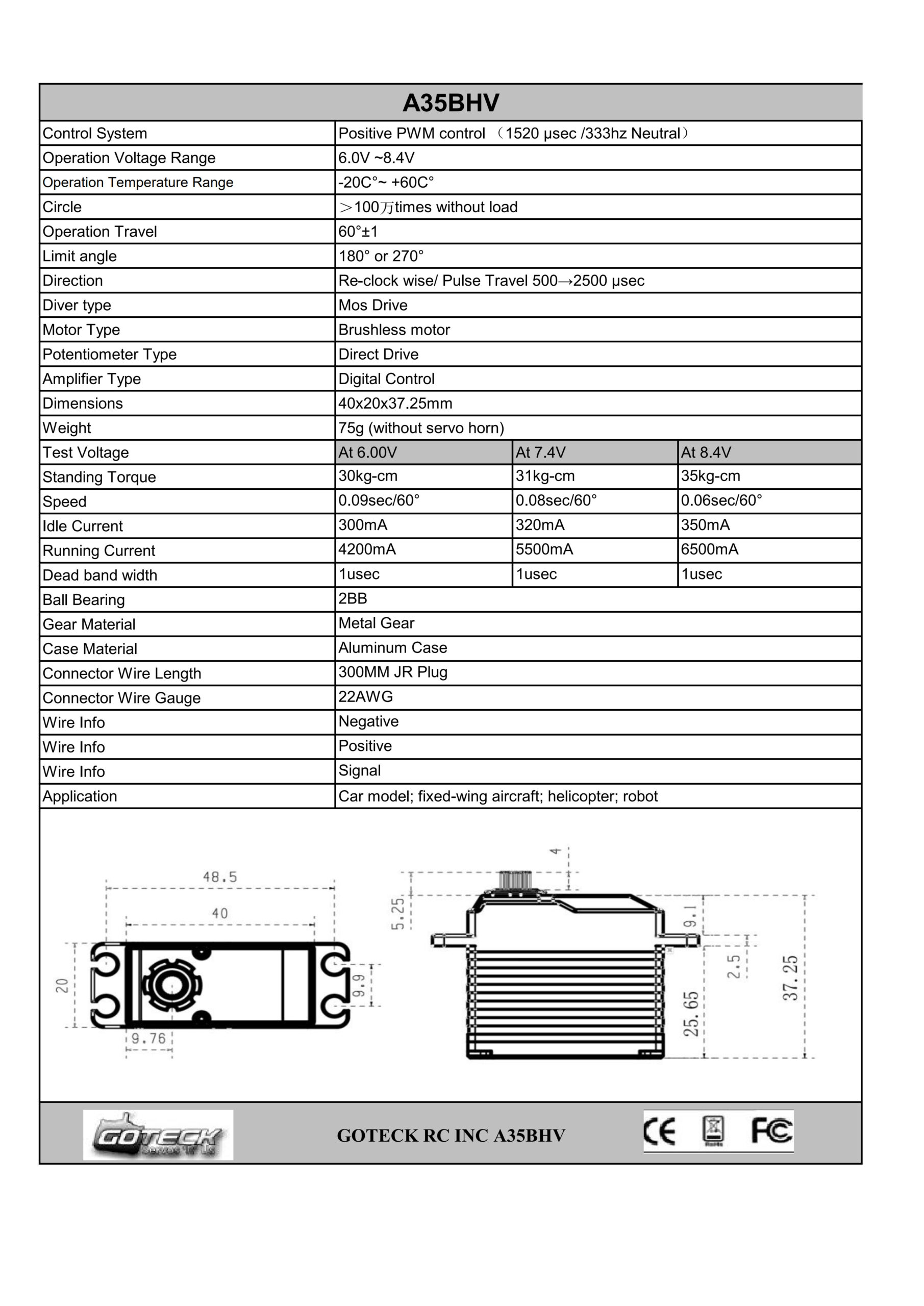 GOTECK A35BHV Servo is a Brushless Digital Servo,which Feature is Super Speed and High Power!It Delivers Incredible Power and Can Be Used for RC Helicopters,Airplanes,Cars,and Trucks When a Standard Servo Is Required!