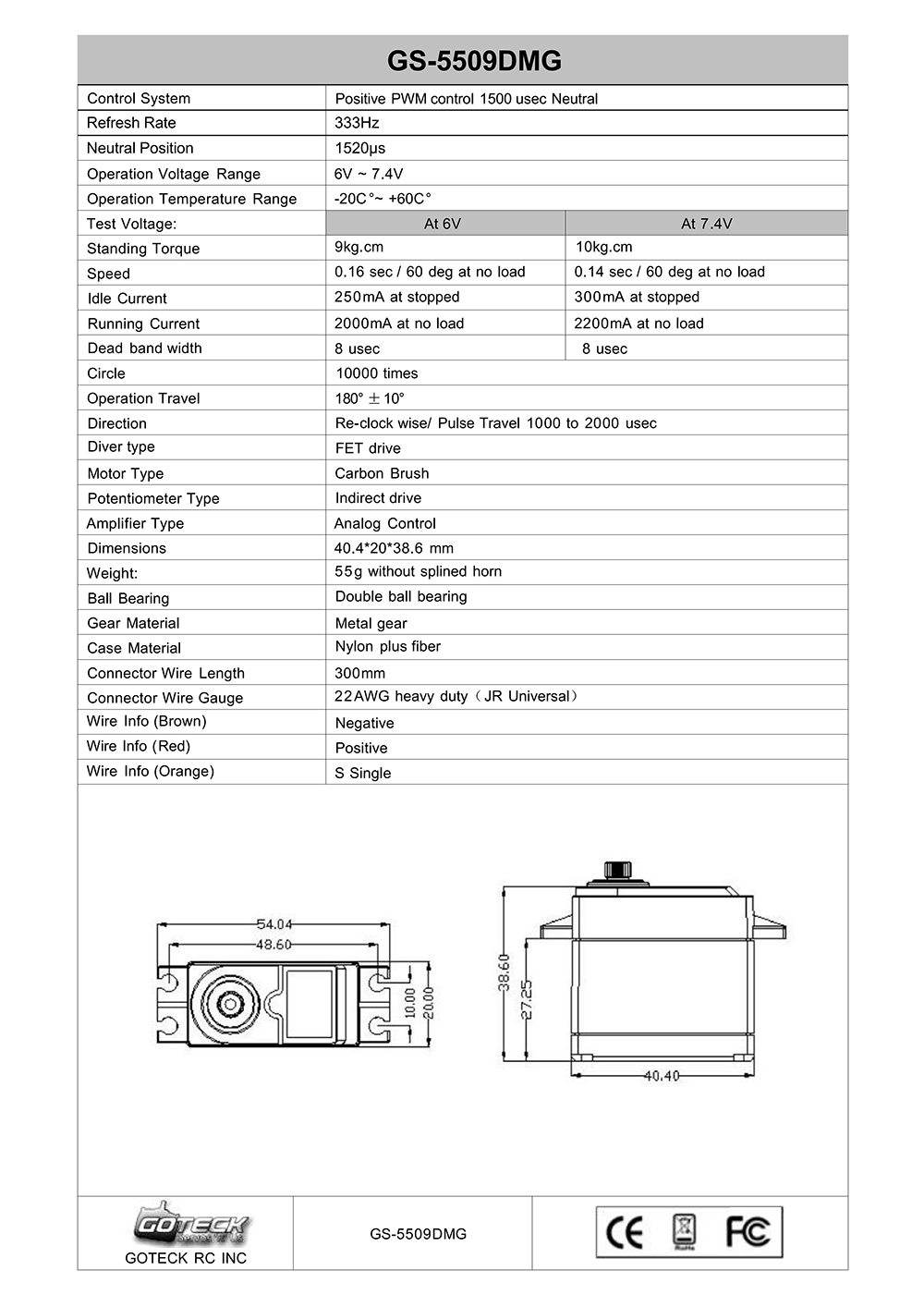 No load speed: 0.16s/60° at 6V; 0.14s/60° at 7.4V;