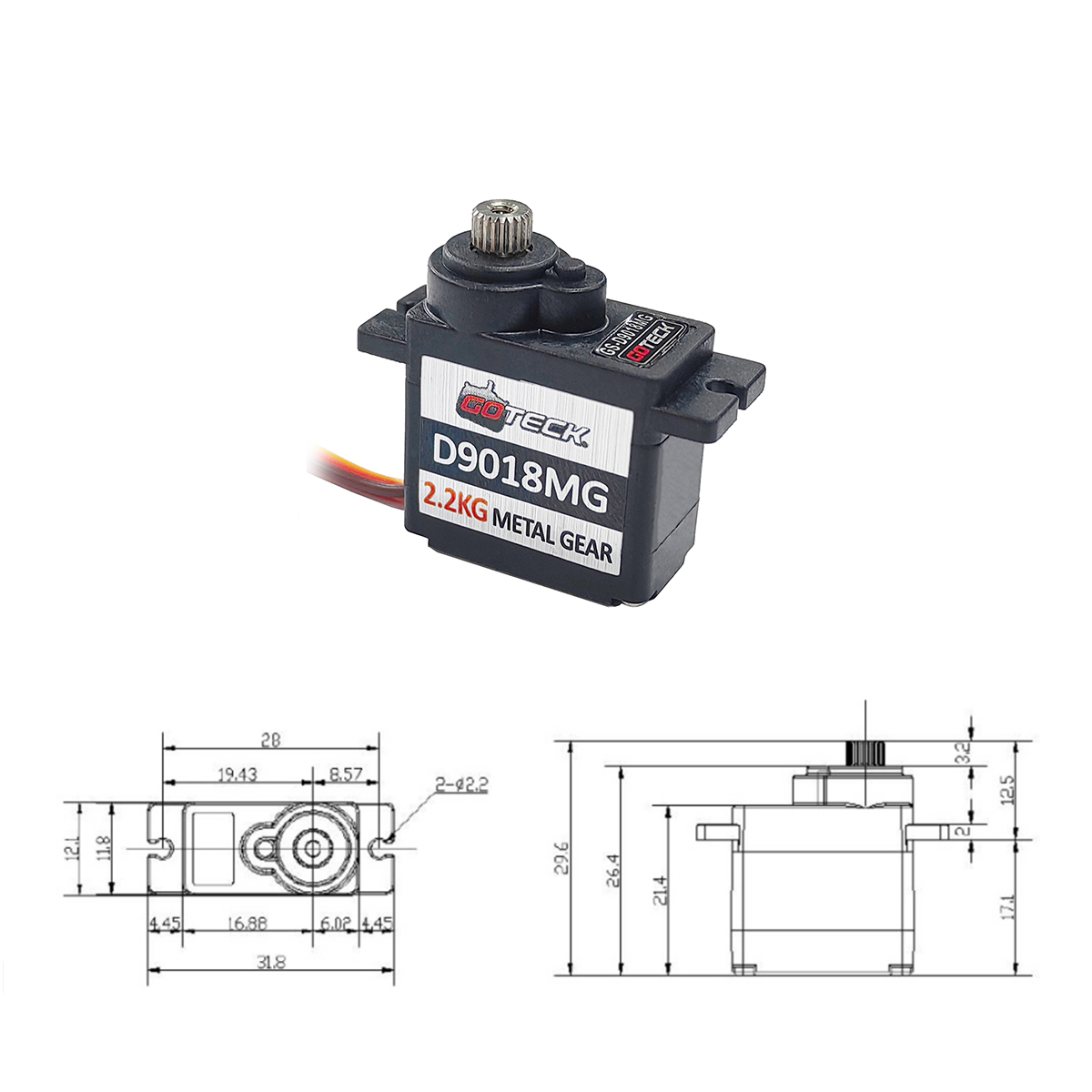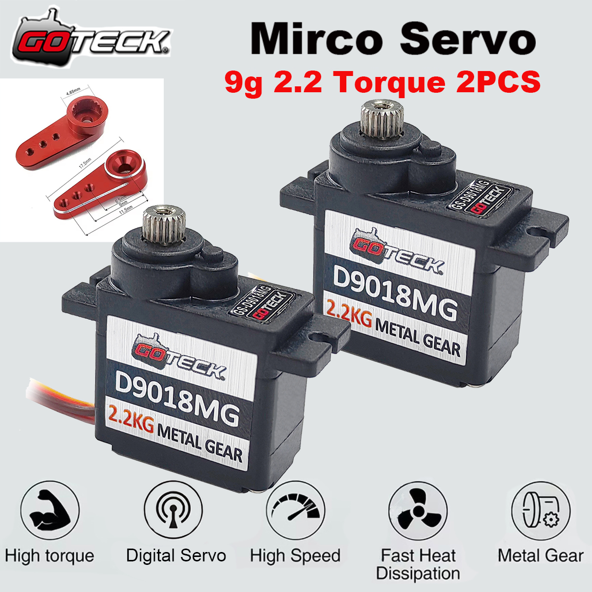 GOTECK D9018MG Micro Servo high-precision Full Metal Gear (more durable and prevent tooth sweeping) with Hard Anodizing, combined with Ball Bearings, has a longer service life.