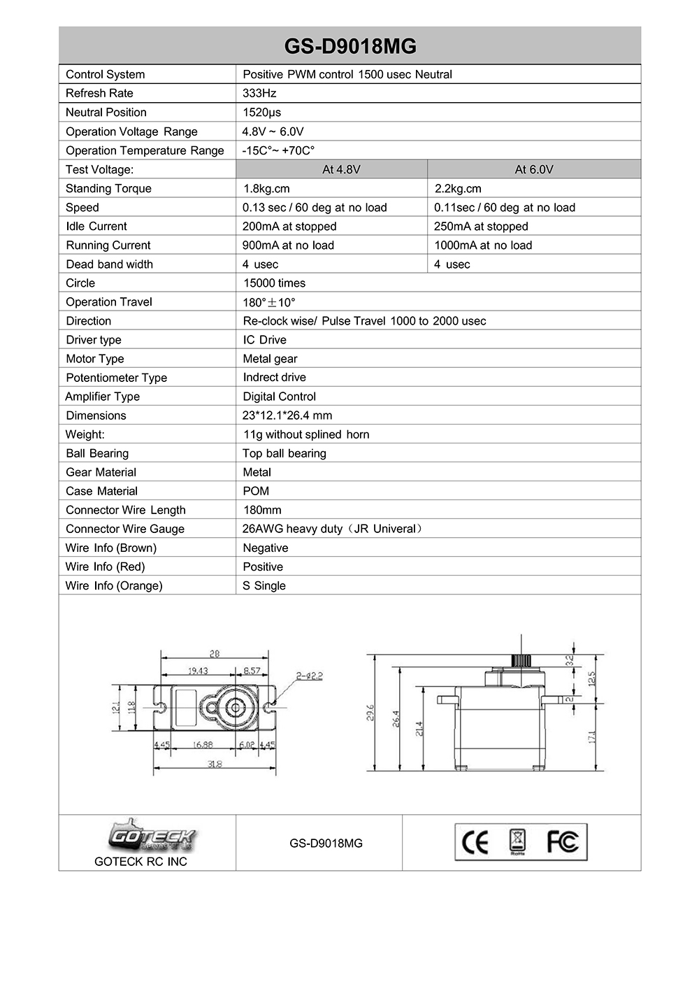 Torque: 1.8kg.cm at 4.8V; 2.2kg.cm at 6V;