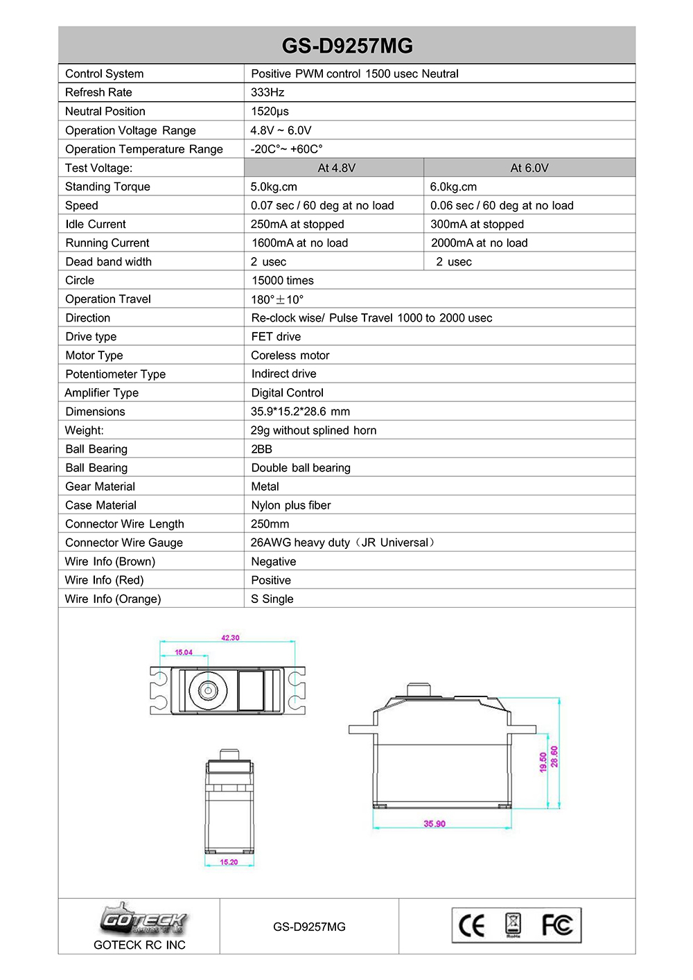 No load speed: 0.07s/60° at 4.8V; 0.06s/60° at 6V;